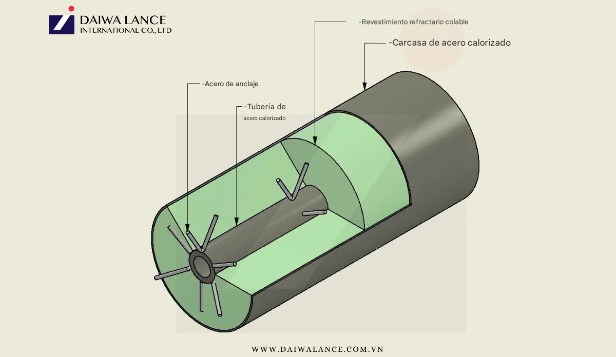 - Recubrimiento refractario: Revestimiento con alto contenido de alúmina que se somete a un proceso de secado adecuado para soportar altas temperaturas, esfuerzos, choques térmicos y desgaste por la escoria.